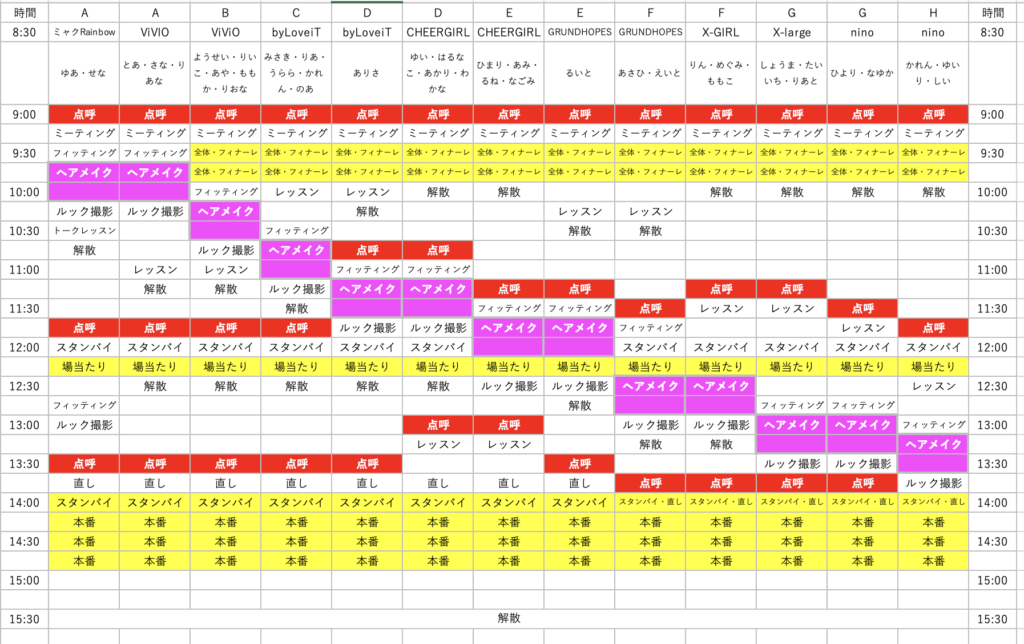 集合→ヘアメイクもしくはフィッティング→一度保護者様の元へお戻し→再集合→ヘアメイクのお直しや最終チェック(リップ確認など)→本番